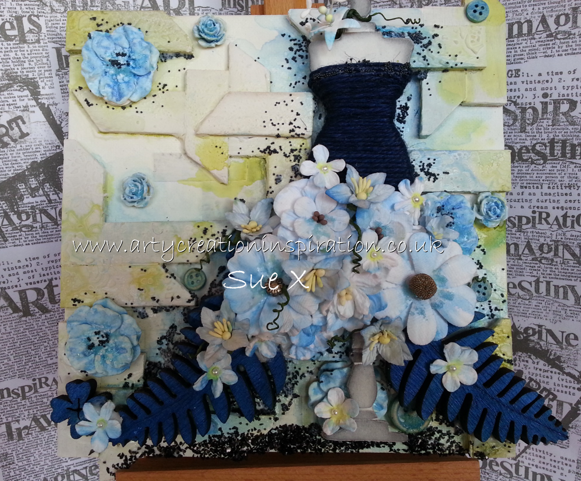I started by making a background paper from A4 card and distress inks then adding stamping to add interest. This was then cut to a 14cm x14cm background, layered up onto a darker colour and adhered to the card blank.